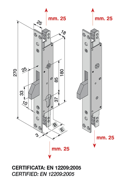 Serratura a 3 punti di chiusura per grate e persiane blindate